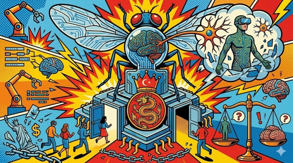 Dijital Ölümsüzlüğe İlk Adım: 125.000 nöronlu bir sinek beyninin haritalandırılıp simülasyonda “kendi kendine” kararlar vermesi, nörobilimde bir milattır. Bu teknoloji, Alzheimer gibi hastalıklara çözüm olma vaadi taşısa da, insan bilincinin dijital ortama aktarılmasına dair etik tartışmaları da beraberinde getiriyor.