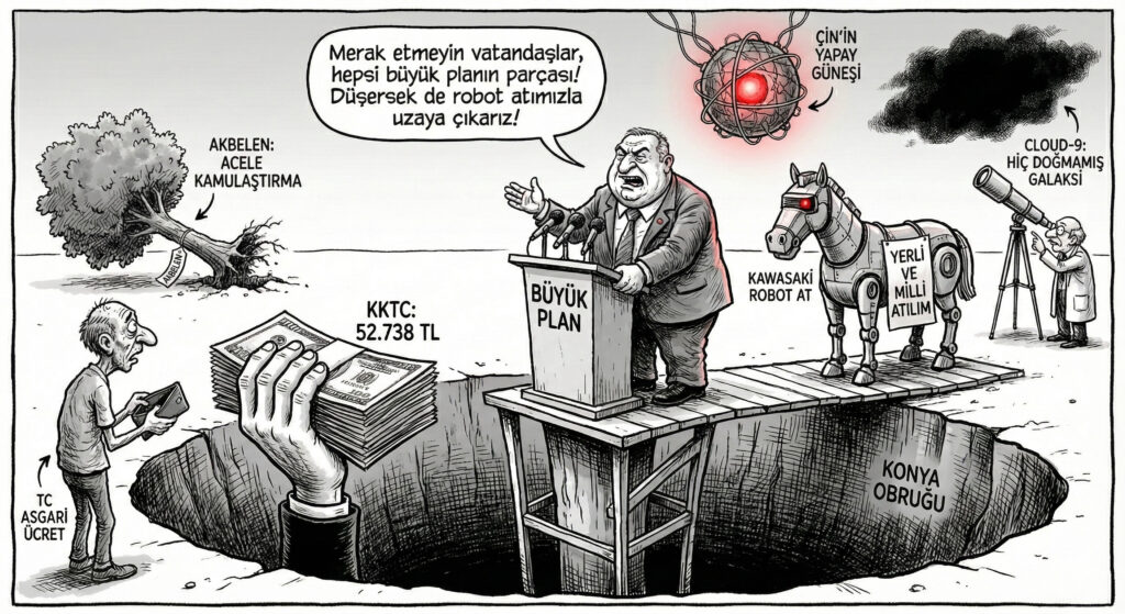 2026’nın bu güzel Ocak gününde, altımızda 700 obruk, cebimizde Kıbrıs’ın yarısı kadar maaş ve altımızda robot atımızla, hiç doğmamış galaksilere bakıp “En iyisini siz yapmışsınız” demekten başka çaremiz kalmıyor.