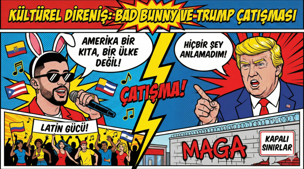 Kıta vs. Ülke: Bad Bunny’nin “Amerika bir ülke değil, bir kıtadır” alt metni, ABD’nin Latin Amerika üzerindeki hegemonik bakışına (Monroe Doktrini) bir meydan okuma olarak görüldü.