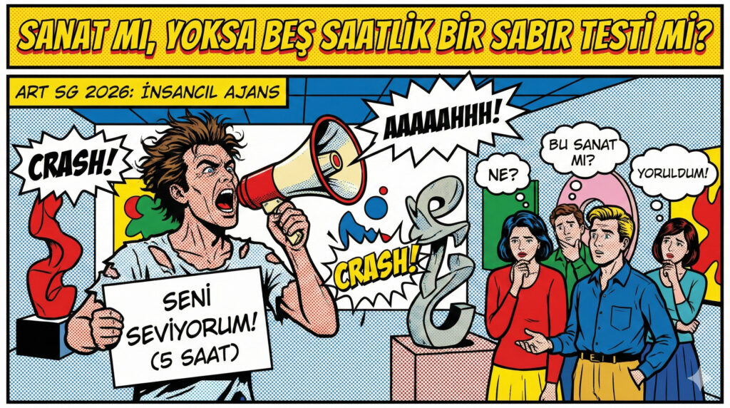 Singapur’da düzenlenen “ART SG” fuarı, “İnsancıl Ajans” (The Humane Agency) temasıyla kapılarını açtı. Modern sanatın ulaştığı son nokta ise kırmızı bir odada elinde cam parçasıyla tam beş saat boyunca “Seni seviyorum” diye bağıran bir performans sanatçısı oldu. Sanatın bu “derin” mesajını anlamak için muhtemelen sizin de beş saatlik bir boş vaktiniz ve gerçek dünyadan kopuk bir zihniniz olması gerekiyor. Ama hey, buna “şiddet içeren bir sevgi rituali” deniliyor, o yüzden sorgulamayın, sadece izleyin (veya kaçın).