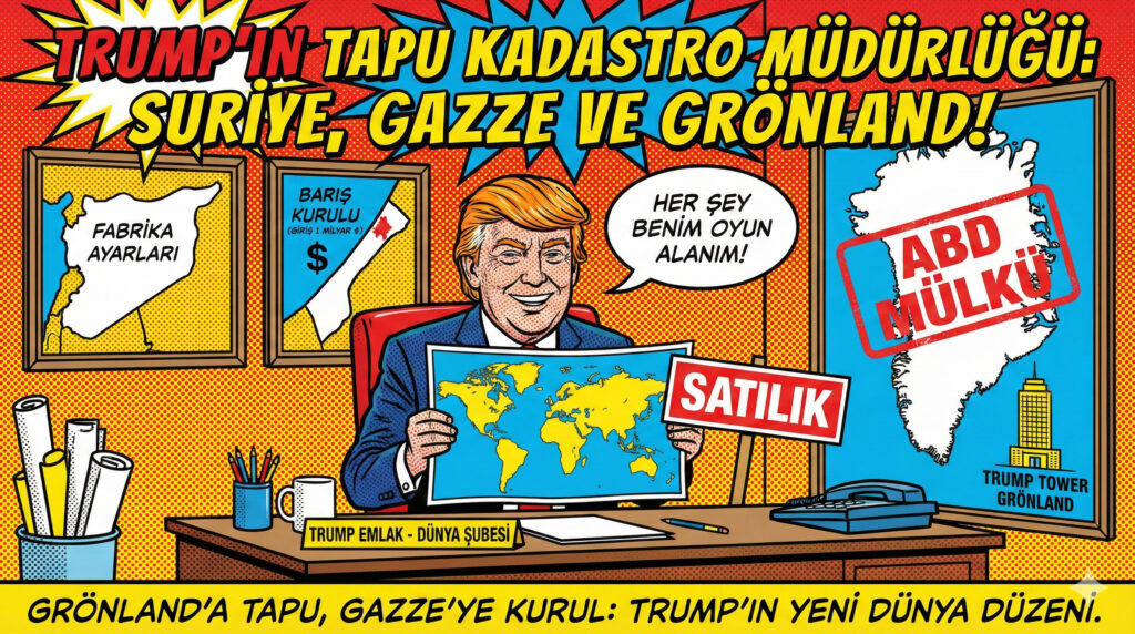 Öte yandan Trump, “Gazze Barış Kurulu” kurmuş. Kurulda damadı Jared Kushner’den eski İngiltere Başbakanı Tony Blair’e kadar her türlü “vukuatlı” isim var. Kurula girmek isteyen ülkelerden de “giriş anahtarı” niyetine 1 milyar dolarcık talep ediyor. Yetmiyor, Grönland’ı almak için Danimarka’ya gümrük vergisiyle şantaj yapıyor. Adamın Ovel Ofis’teki haritasında Kanada ve Grönland şimdiden Amerikan bayrağına boyanmış bile. Vizyon dediğin budur; dünyayı ya satın alırsın ya da gümrükle döversin!
