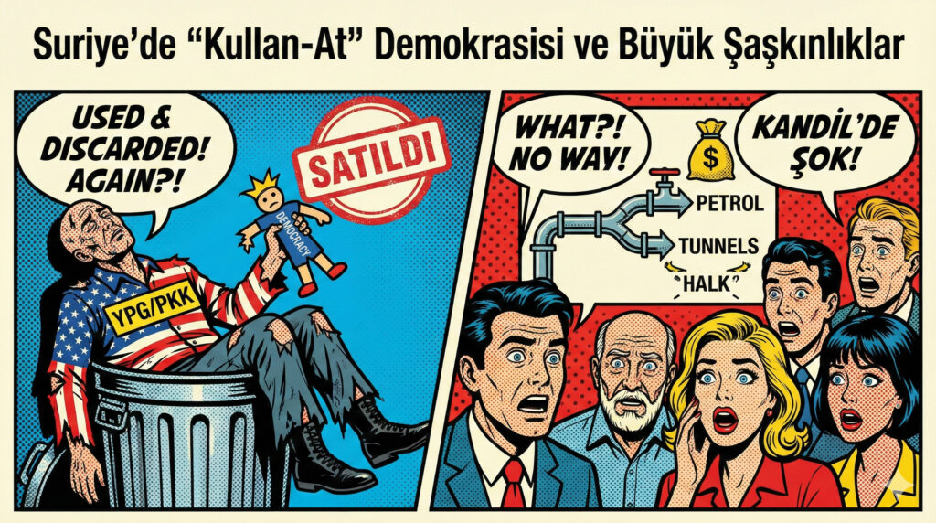 Listenin başında, Ortadoğu’nun bitmek bilmeyen o meşhur pembe dizisi var. Başrol oyuncusu ABD, yıllardır “en iyi dostum” dediği, uğruna dergilerde kapaklar bastırdığı YPG/PKK kanadına yine o meşhur “seni tanımıyorum” bakışını attı. Şaşırdık mı? Tabii ki hayır. Ama Kandil ve çevresinde sanki ilk kez “satılmışlar” gibi bir hayal kırıklığı hakim. Fransız dergilerinde “laik kahramanlar” olarak poz verenlerin, aslında bölgedeki petrol gelirlerini halka değil de tünellere ve Kandil’e bağladığı gerçeği, bölgedeki 11 Arap aşireti uyanınca “pardon” denilerek geçiştirilemiyor. Şimdi ise “hadi bakalım, merkezi hükümetin altına girin de uslu birer asker olun” deniyor. Ne demişler? Amerikan gemisine binen, kıyıya varmadan ıslanacağını bilmeliydi.