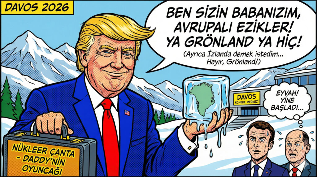 Davos’ta uzun süredir devam eden “ölü toprağı,” Donald Trump’ın fırtına gibi (ve tabii ki iki saat rötarla) esmesiyle dağıldı. Trump, sahneye çıkıp dünyaya adeta bir emlakçı edasıyla ayar verdi. Adamın vizyonu o kadar geniş ki, Grönland’ı bir buz kalıbı gibi satın almak istiyor. Alamazsa da küsüyor; NATO liderlerine “Size 30 yıl baktım, hepiniz Almanca konuşacaktınız” diyerek fırça atıyor. İşin en absürt tarafı ise, koca imparatorun Grönland ile İzlanda’yı 56 kez karıştırması. Kimin umurunda? Elinde nükleer çantayla “Ben sizin babanızım” (Daddy) dedirtiyor mu, dedirtiyor.