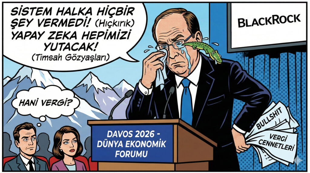Dünyanın en büyük kapitalistlerinden BlackRock CEO’su Larry Fink, Davos kürsüsünden “Sistem halka hiçbir şey vermedi, yapay zeka beyaz yakalıları yutacak” diyerek hepimizi hüzünlendirdi. Milyarlarca dolarlık imparatorluğun tepesinde oturup, “Gelir adaletsizliği çok fena, halk çok öfkeli” diye dert yanması, tam anlamıyla bir “bullshit” örneği. Çözüm önerisi var mı? Yok. Vergi ödemek var mı? Tabii ki hayır. Ama “öz eleştiri” çok havalı, değil mi?