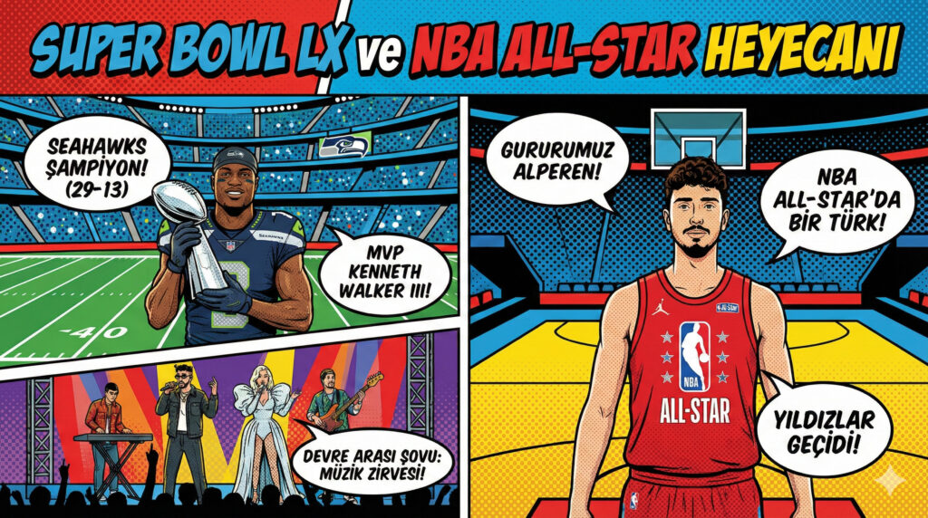 Amerikan sporları için bu hafta hem bir son hem de bir başlangıç niteliğindeydi. 8 Şubat’ta oynanan Super Bowl LX‘in yankıları hafta boyunca sürdü. Seattle Seahawks, New England Patriots’ı 29-13 mağlup ederek şampiyonluğa ulaştı. Maçın en değerli oyuncusu (MVP) seçilen Kenneth Walker III, 135 yardalık koşusuyla galibiyetin mimarı oldu. Devre arası şovunda Bad Bunny, Lady Gaga ve Ricky Martin ile sergilediği performansla dijital platformlarda dinlenme rekorları kırdı. Diğer yandan, NBA’de All-Star heyecanı doruğa ulaştı. Sakatlığı nedeniyle kadrodan çıkarılan Shai Gilgeous-Alexander’ın yerine milli gururumuz Alperen Şengün‘ün All-Star kadrosuna dahil edilmesi Türkiye’de ve dünya basınında geniş yer buldu.
