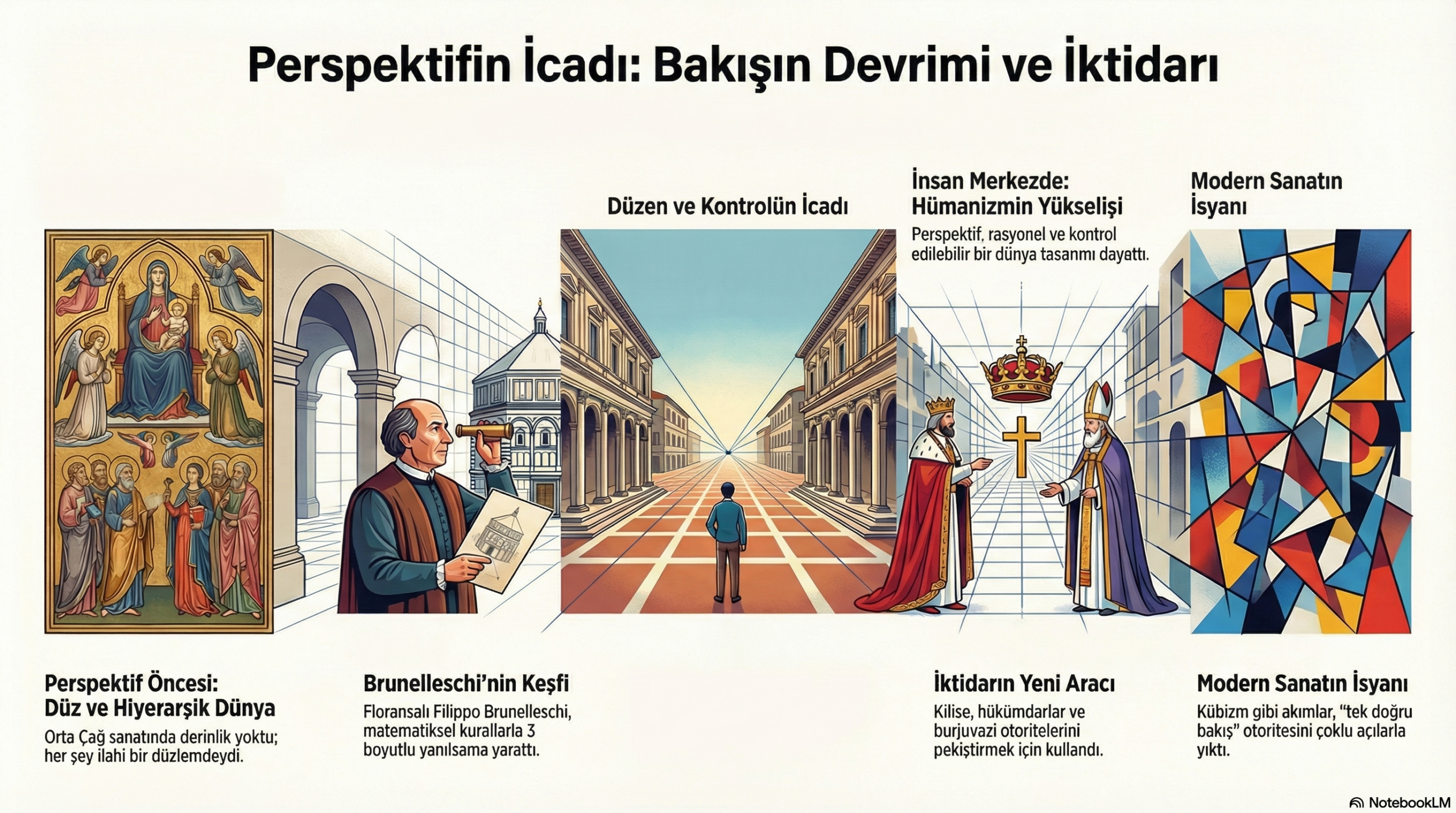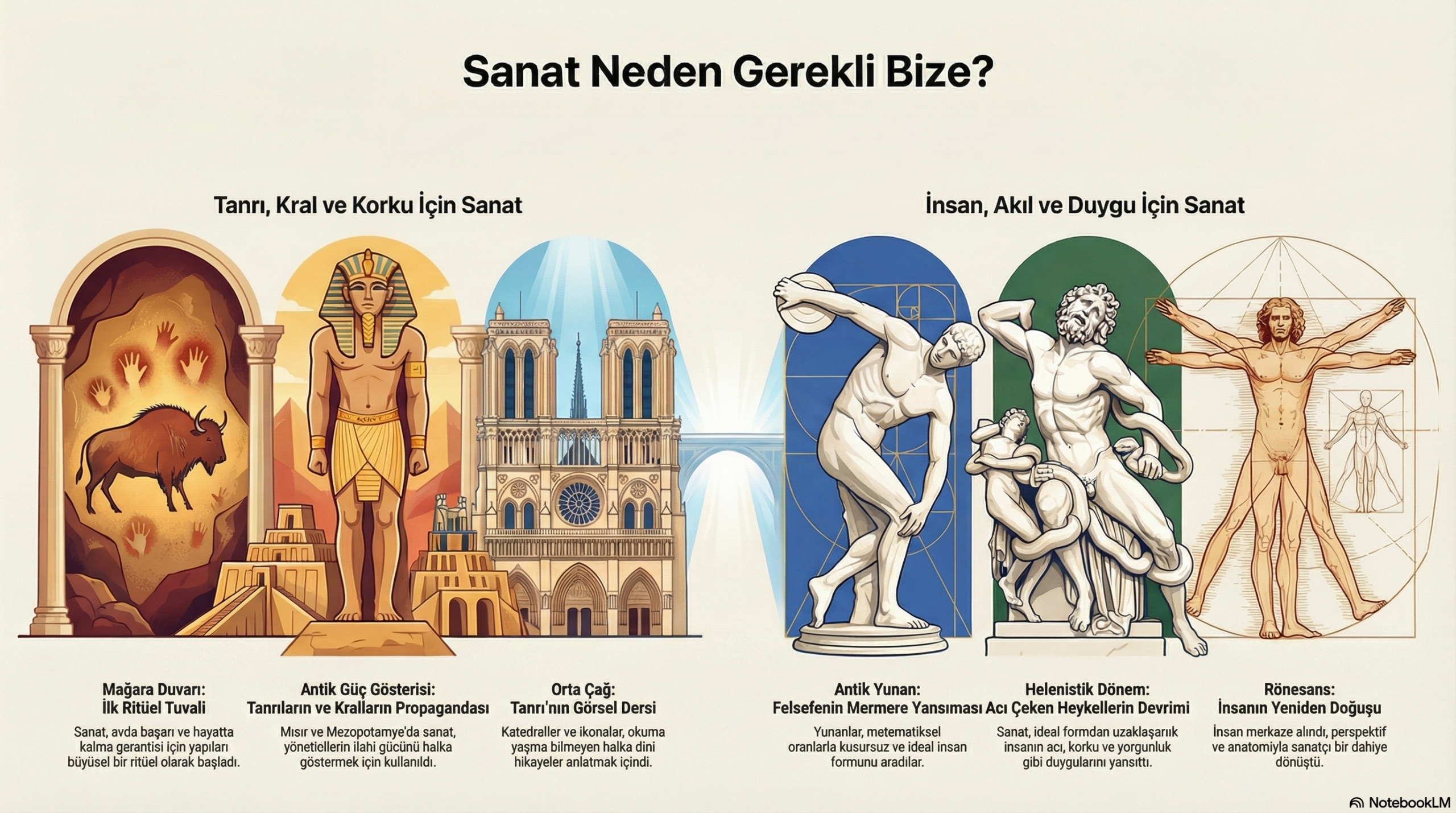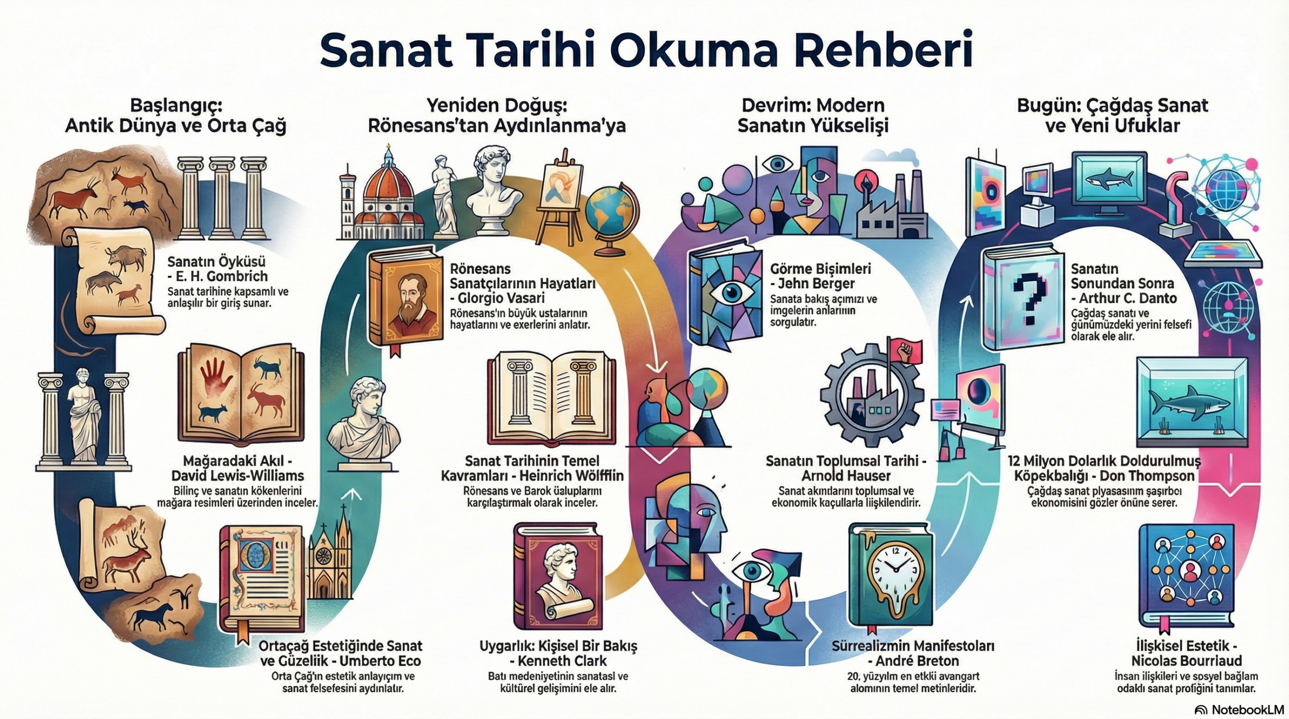 Metin, okuyucuyu "mağara resimlerinin görüldüğü o kadim dönemlerden, günümüzün dijital ve yapay zeka ile şekillenen sanat formlarına uzanan bir yolculuğa" davet etmektedir. Mussorgsky'nin eserindeki ünlü "Promenade" (Gezinti) teması, bir tablodan diğerine (yani bir dönemden diğerine) yürüyen izleyiciyi temsil eder. Bu tema, metinde vurgulanan sanatın "sabit prensiplerini" simgelerken, aradaki değişken bölümler sanatın "değişen yüzlerini" ifade eder. Eserin yapısı, metnin okuyucuyu "sanata dair kapsamlı... bir bakış açısı geliştirmeye davet" eden rehber niteliğiyle birebir uyuşur.
