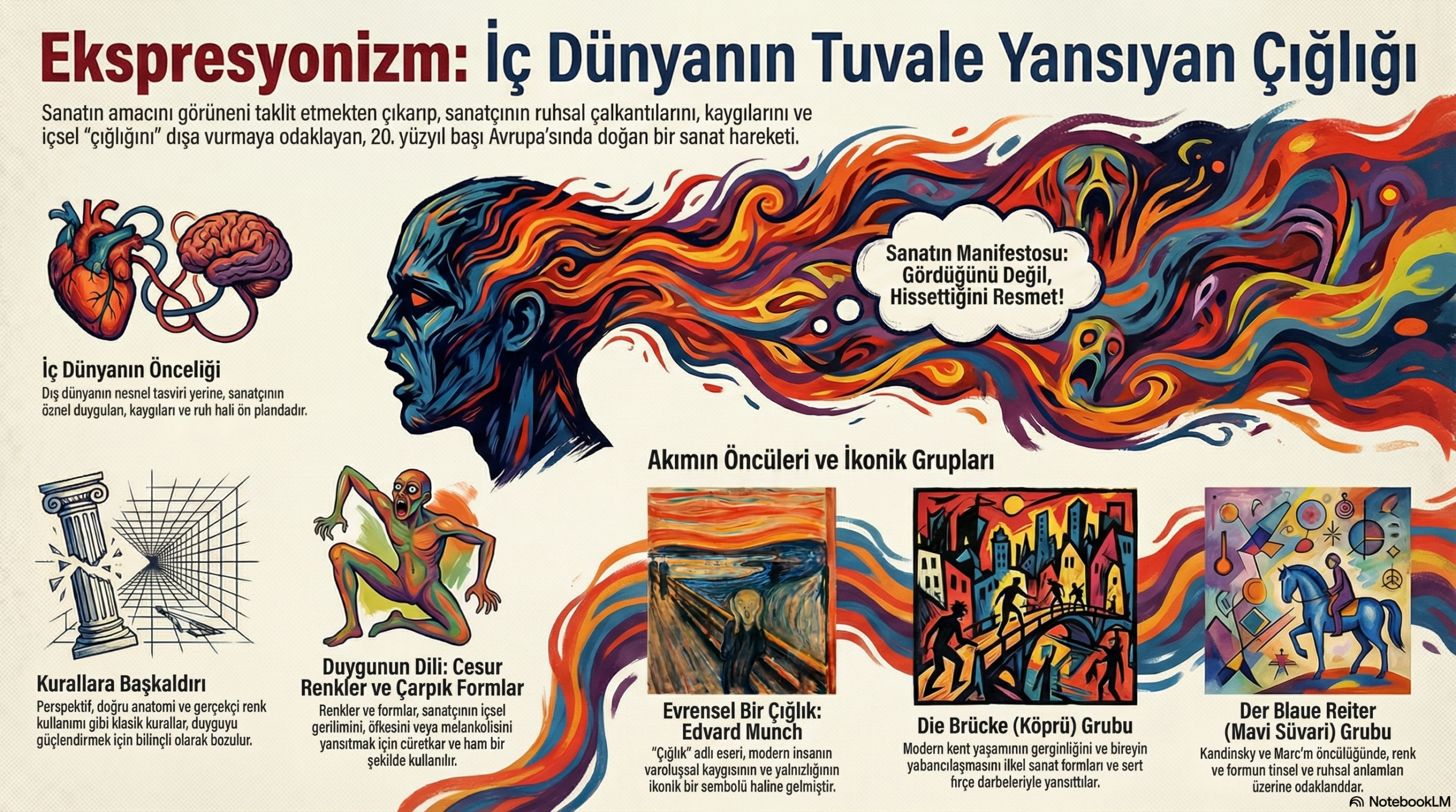Metinde el izlerinin, "Ben buradaydım, beni unutma!" diyen bir isyan ve çığlık olduğu anlatılır. Ayrıca sanatın, temel hayatta kalma mücadelesini aşmış bireyin "boşlukla yüzleşmesi" ve bir "fazlalık" sonucu doğduğu belirtilir. Stravinsky'nin eserindeki patlayıcı orkestrasyon ve kaotik zirveler, insanın o karanlık mağarada, doğanın acımasızlığı karşısında varlığını kanıtlama dürtüsünü ve "varoluşun mürekkebini" duvara çalma anındaki o ilkel heyecanı işitsel olarak betimler.